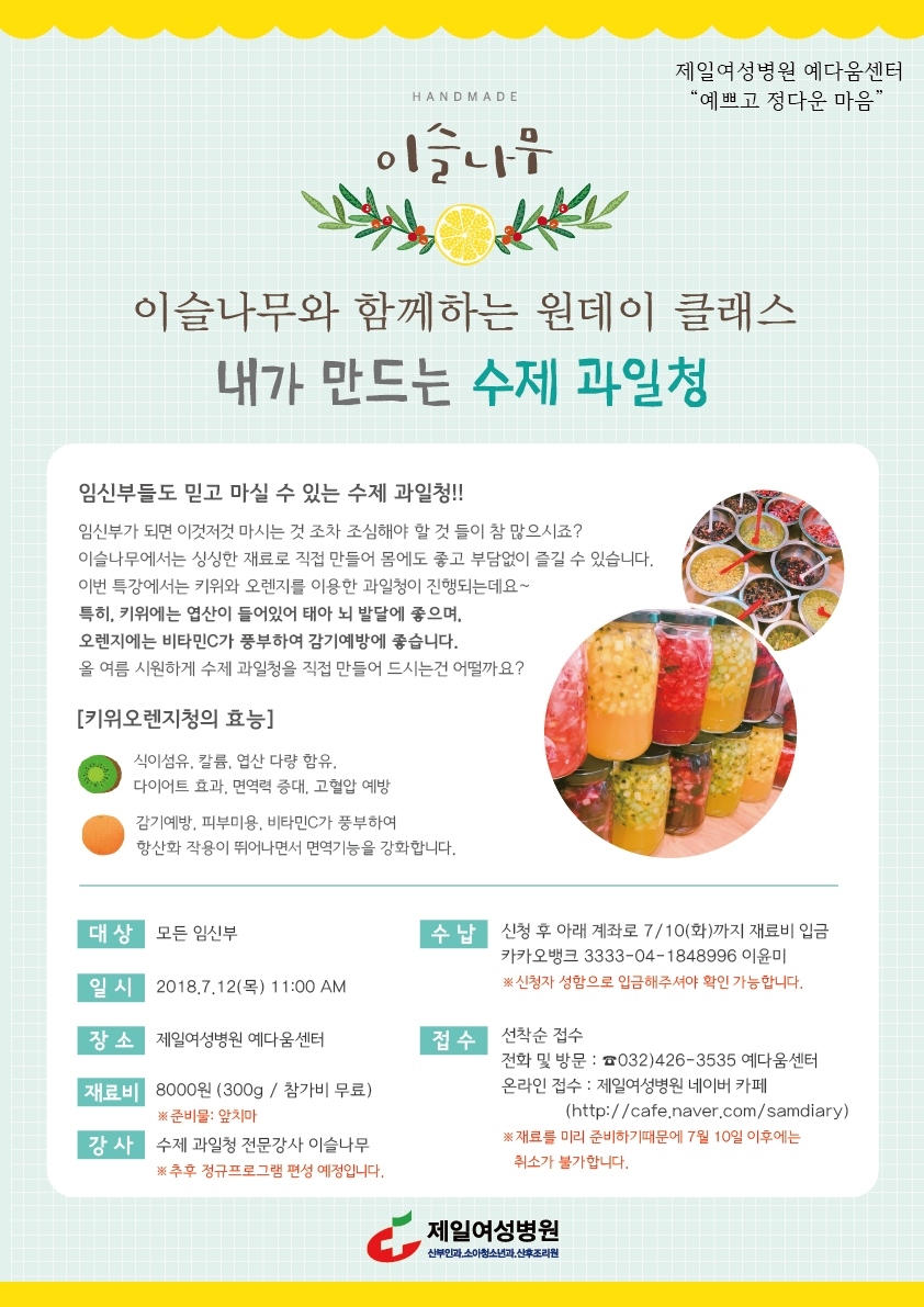 이슬나무와 함께하는 "내가 만드는 수제 과일청" [7월 예다움 원데이 특강] [접수 방법 안내] 1. 제일여성병원 네이버 카페 특강 게시글(http://cafe.naver.com/samdiary/34148)에 댓글을 달아주세요. (연락처 뒷자리, 접수)2. 댓글을 남긴 후 아래 접수 바로가기를 클릭하셔서 신청서 작성 후 제출해주시면 됩니다. 접수 바로가기 >> http://naver.me/GbTtFvUz [ 신청 전 필독 사항 ] - 신청서를 작성해주셔야 접수 완료가 되시며, 7/10(화)까지 해당 계좌로 재료비를 입금해주시면 접수 완료입니다. (신청자 성함과 입금자명이 동일해야합니다.) - 마감된 경우 대기 신청으로 받으며 접수신청 방법과 동일합니다. (연락처 뒷자리, 대기신청 ) |